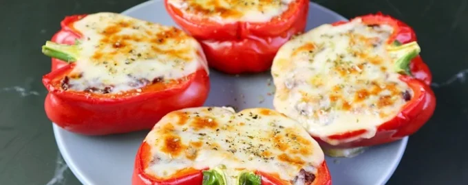 - Cepšanas traukā ielej nedaudz ūdens, tad paprikas pusītes pildi ar omletes maisījumu un pārkaisi ar sieru.