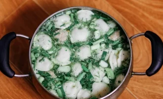 - Tad ielej ūdeni, pienu un uz lēnas uguns uzkarsē līdz vārīšanās temperatūrai un uz lēnas uguns vāra dažas minūtes.